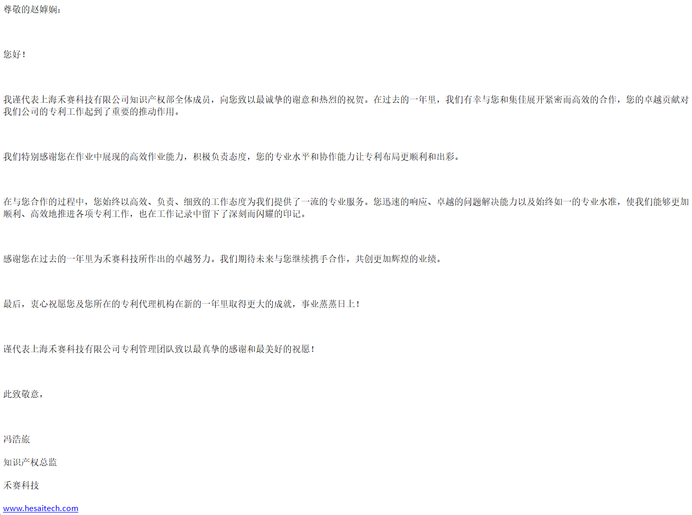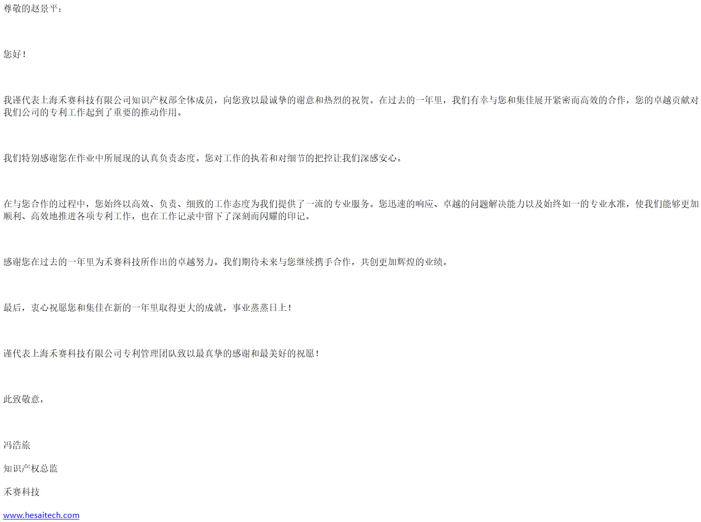 新年伊始,集佳喜获来自客户上海禾赛科技有限公司的感谢信,对雷速上海分所提供的优质服务表示感谢。